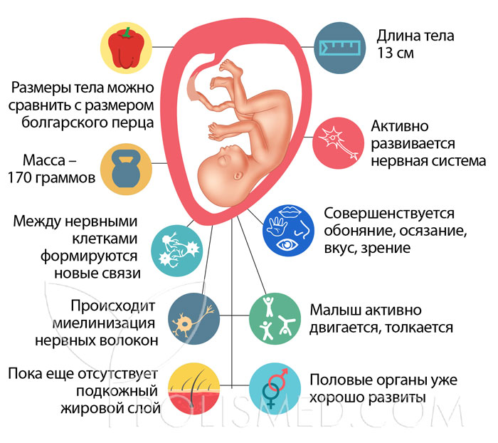 На этом сроке активно развивается нервная система. Нервы будущего ребенка покрываются миелином, изолирующим нервные волокна и обеспечивающим нормальную скорость передачи импульсов. Формируются новые связи между нервными клетками, совершенствуются обоняние, осязание, вкус и зрение. Слух становится более острым: малыш начинает слышать звуки от матери и извне.