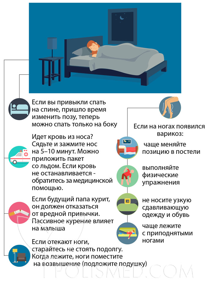 · С 18 недели беременности нужно спать только на боку. Лежа на спине, увеличенная матка сдавливает вены, что уменьшает возврат крови к сердцу. Если вы привыкли спать на спине, пора изменить позу.