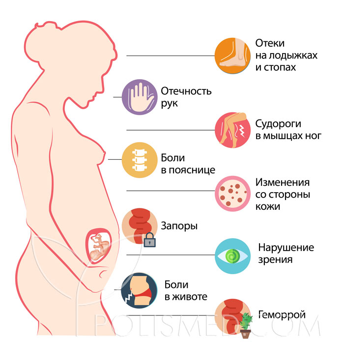 Геморрой возникает из-за давления матки на вены, нарушающего отток крови из области таза. Также может наблюдаться варикозное расширение вен на ногах.