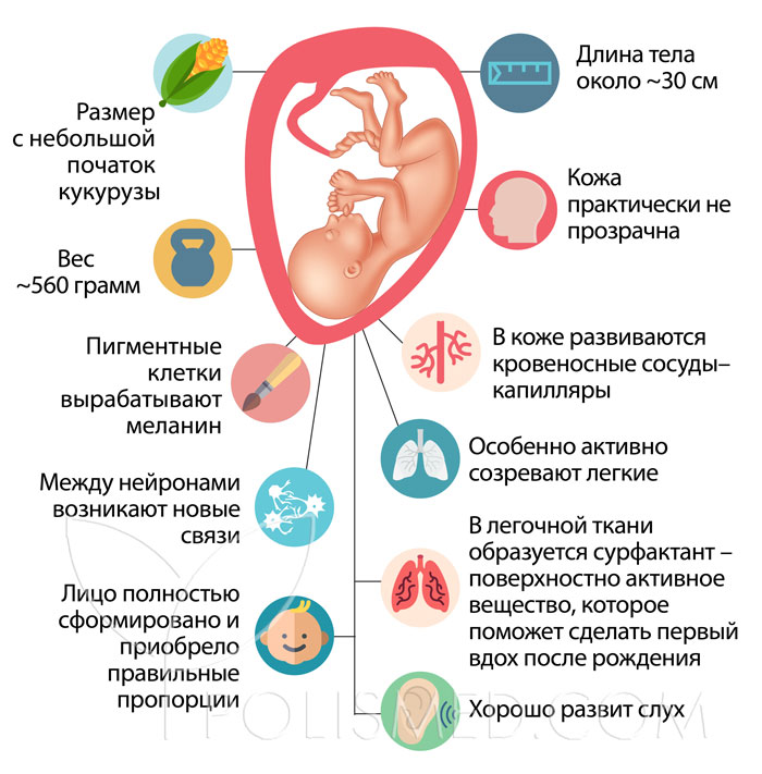 На 24 неделе вы находитесь примерно на шестом месяце беременности. Малыш по размеру сопоставим с небольшой дыней или початком кукурузы, весит от 500 граммов до 1,3 килограмма и набирает около 160 граммов в неделю, рост составляет примерно 30 см.