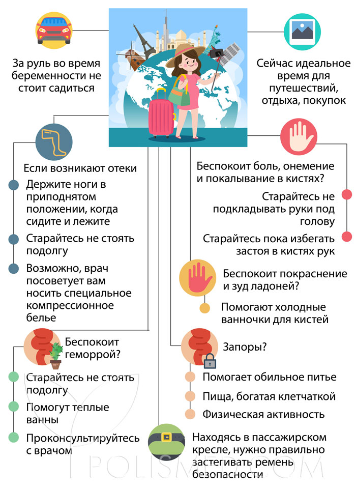 · Во время беременности не рекомендуется садиться за руль, так как беременные женщины чаще попадают в аварии. В пассажирском кресле важно правильно пристегнуть ремень безопасности: нижняя лямка должна проходить под животом, а верхняя – между молочными железами, по центру грудной клетки.