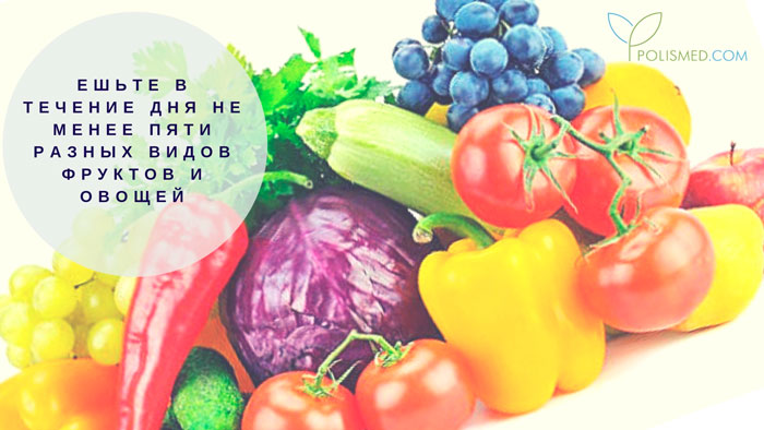 Употребляйте не менее пяти видов фруктов и овощей в день. Они обеспечивают необходимые витамины и минералы. Клетчатка из растительных продуктов нормализует пищеварение и предотвращает запоры. Фрукты и овощи можно есть свежими, замороженными или консервированными. Свежие продукты обязательно мойте, чтобы избежать вредных микроорганизмов.