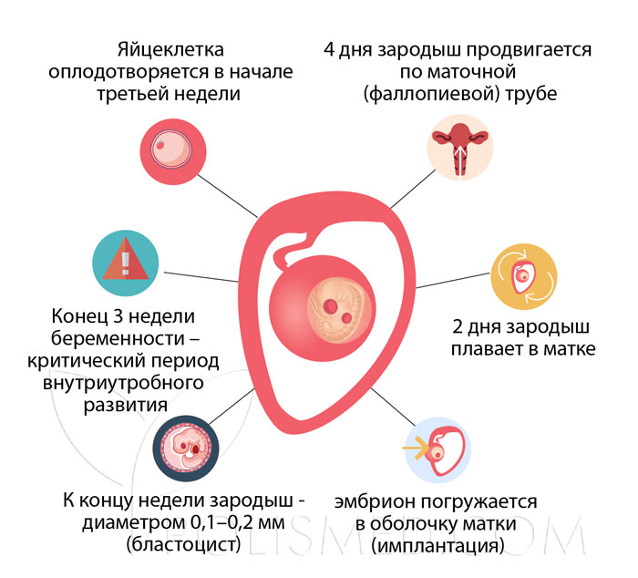 К концу третьей недели зародыш представляет собой шарик диаметром 0,1–0,2 мм, внутри которого находится полость с жидкостью. На этой стадии он называется бластоцистой и состоит из 200–250 клеток. На генетическом уровне уже определены пол, цвет глаз, волосы и другие характеристики. Конец третьей недели – это первый критический период внутриутробного развития. В это время зародыш уязвим из-за активного роста и формирования органов. Негативные факторы могут привести к выкидышу, поэтому будущей маме следует быть осторожной и следить за образом жизни.