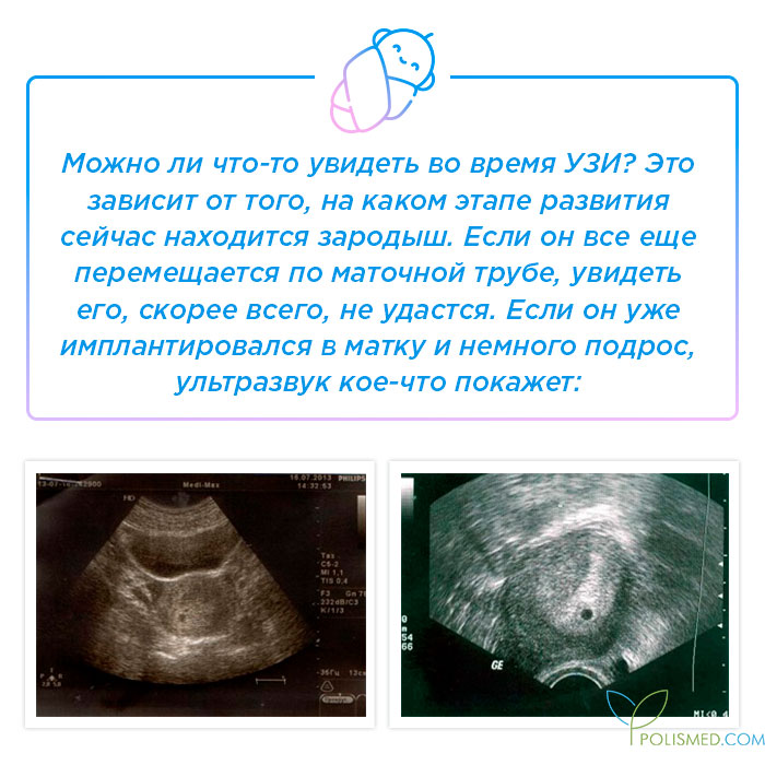 Можно ли что-то увидеть на УЗИ? Это зависит от стадии развития зародыша. Если он еще движется по маточной трубе, его не удастся увидеть. Если он уже имплантировался в матку и немного подрос, ультразвук может показать некоторые детали.