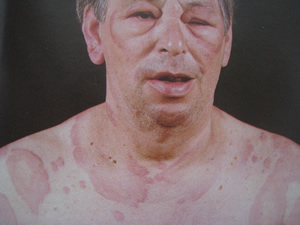 | Кожа и слизистые оболочки | Жар, зуд, крапивница на внутренней поверхности бедер, ладонях и подошвах, возможен отек лица, шеи (губы, веки, гортань), половых органов и нижних конечностей. При быстром развитии анафилаксии кожные проявления могут отсутствовать или появиться позже. 90% случаев сопровождаются крапивницей и отеком. | |