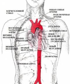 Аорта делится на три части: восходящий отдел, дугу аорты и нисходящий отдел, который подразделяется на грудную и брюшную части.