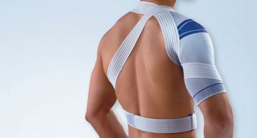 - Бандажи — изделия из плотной эластичной ткани, фиксирующие сустав, но не ограничивающие его подвижность. Используются не только для лечения пациентов, страдающих от болезней или травм плеча, но и для спорта в целях предупреждения травм.