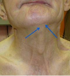 Острые боли в передней части шеи могут быть связаны с воспалением околоушных слюнных желез, которые увеличиваются. Пациенты могут жаловаться на слабость, утомляемость, мышечные боли и другие симптомы вирусной инфекции. Часто наблюдаются сухость во рту, боли в области уха и челюсти, усиливающиеся при разговоре и жевании.