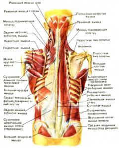 - Большая ромбовидная мышца – ромбовидная мышца под трапециевидной, расположенная между лопатками. Начинается от остистых отростков первых четырех грудных позвонков и направляется к внутреннему краю лопатки. Сокращение приводит к приведению лопатки к срединной линии, а сокращение нижних пучков вызывает вращение нижнего угла лопатки внутрь.