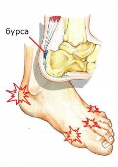 - область пятки (воспаление синовиальной сумки между ахилловым сухожилием и пяточной костью).