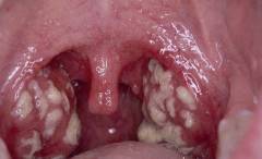 - на миндалинах появляется сероватый налет или круглые бляшки, которые через 3 дня превращаются в плотные пленки, прочно прикрепленные к слизистой;