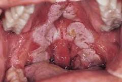 - Распространенная форма. 10-15% заболевших. Бактерии могут распространиться на твердое небо и язычок. Интоксикация выражена значительно, высокий риск осложнений.