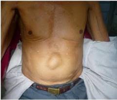 - Выпячивание в средней части живота, заметное и прощупываемое. При натуживании или кашле ощущается толчок.