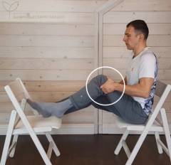 - Наклоны вперед и назад. Упираясь пятками в стул, выполните десять наклонов стоп вперед, затем десять раз потяните стопу и пальцы к себе.