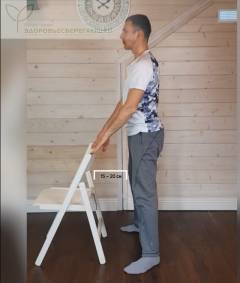 - Установите стул перед собой, держитесь за верхнюю часть спинки, оставив расстояние 15-20 см.