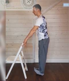 - Встаньте прямо рядом со стулом, одной рукой держитесь за его спинку.