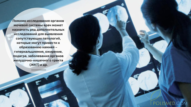 Нарушения обмена веществ (гиперпаратиреоз, цистинурия) | Ощущение тяжести в пояснице, дизурия (нарушение мочеиспускания) | Биохимический анализ крови, анализ мочи на состав камней |