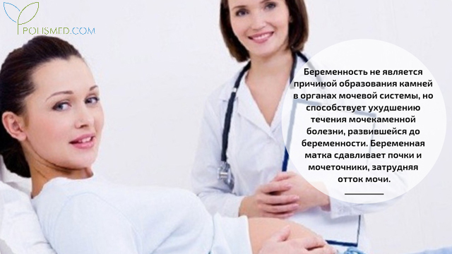 Беременность не вызывает образование камней, но может усугубить уже существующую болезнь. Увеличенная матка давит на почки и мочеточники, затрудняя отток мочи. Гормональные изменения, повышение концентрации солей в моче и нарушения обмена веществ могут способствовать образованию камней. Женщина должна находиться под наблюдением уролога на протяжении всей беременности.