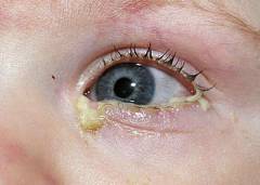 | Конъюнктивит | Внутренняя оболочка век отекает и наполняется жидкостью, что создает условия для размножения вирусов. Появляются гнойные выделения из глаз. | |