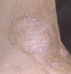 Форма заболевания возникает из-за расширения очага, при этом элементы сыпи в центральной части исчезают, образуя кольцевидные образования.