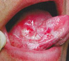 На слизистых образуются дефекты, быстро превращающиеся в остро болезненные язвы и эрозии неправильной или округлой формы.