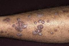 На коже возникает обширное покраснение с отечностью и шелушением. Позже появляются мягкие узелковые образования.