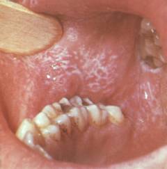 Сначала на слизистой оболочке появляются небольшие серовато-белые папулы. Затем формируются бляшки, не имеющие восковидного оттенка из-за постоянного размягчения. Папулы могут объединяться, создавая кольца, сетки и другие узоры. Обычно они не вызывают боли и не сопровождаются симптомами, что отличает их от эрозивно-язвенной формы.