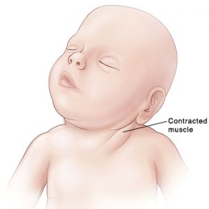 При рождении ребенок выглядит здоровым, его голова свободно поворачивается. Однако на 2-3 неделе можно заметить наклон головы в одну сторону. В это время начинается укорочение грудино-ключично-сосцевидной мышцы, что можно ощутить при пальпации.