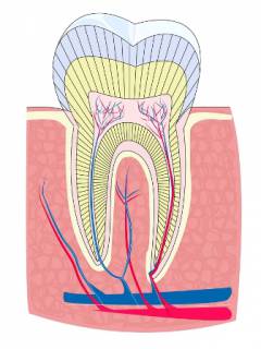 Внутри зуба находится полость с пульпой, состоящей из рыхлой соединительной ткани, сосудов и нервов. Пульпа выполняет три функции: трофическую (питание тканей зуба), пластическую (образование тканей зуба) и защитную (защита от инфекций). Полость делится на коронковую часть и корневые каналы, которые заканчиваются верхушечным отверстием.