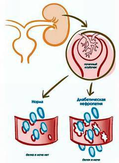 Повышенный уровень сахара в крови приводит к образованию сложных соединений, повреждающих стенки сосудов и увеличивающих их проницаемость, что вызывает диабетическую нефропатию.