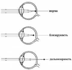 - Миопия (близорукость). Плохо видит удаленные объекты, хорошо — близкие. Параллельные лучи от далеких предметов фокусируются перед сетчаткой.