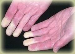 Болезнь Рейно проявляется спазмом дистальных фаланг пальцев при холоде или стрессе, что приводит к бледности, синюшности, онемению и боли. Болезнь Рейно — идиопатическая патология, в отличие от синдрома или феномена Рейно, который является следствием другого заболевания и представляет собой вторичную патологию.