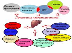 | Причина печеночной недостаточности | Симптомы и признаки | Диагностические методы |