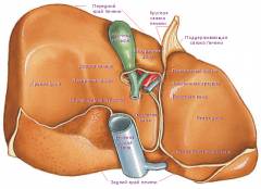 Печень делится на доли с помощью серповидной печеночной связки и двух продольных и поперечной борозд: