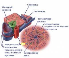 - Внутридольковые капилляры или синусоиды – кровеносные сосуды, через которые химические вещества проникают в гепатоциты и выходят в переработанном виде.
