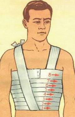 Следующий шаг — иммобилизация грудной клетки в сидячем положении пациента с помощью тугой повязки из бинтов или других материалов, например, полотенец или разрезанных простыней. Бинты накладываются внахлест на выдохе, а их концы фиксируются, что исключает участие межреберных мышц в дыхании и минимизирует движение костных фрагментов. Дыхание осуществляется только за счет диафрагмы.
