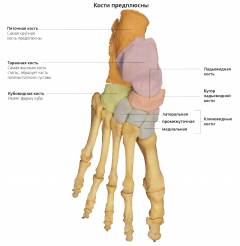 - Предплюсна состоит из 7 коротких губчатых костей в два ряда: в переднем — кубовидная, ладьевидная и три клиновидные (латеральная, промежуточная и медиальная); в заднем — таранная и пяточная кости.