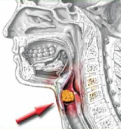 - Опухоль гортани. Злокачественная опухоль в области гортани разрушает окружающие ткани. Степень разрушения влияет на размер пищи, проходящей из глотки в гортань. Опухоль может стать причиной асфиксии, если она частично или полностью перекроет просвет гортани.