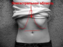 - Сделайте 3-4 надавливания в верхней части живота. Положите кулак правой руки в эпигастральную область (верхняя часть живота, ограниченная мечевидным отростком и реберными дугами), затем прижмите кулак открытой ладонью левой руки и резким движением потяните к себе и вверх. Это увеличивает давление в брюшной и грудной полостях, позволяя воздуху вытолкнуть инородное тело.