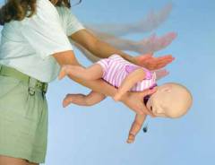 - Прием Геймлиха для детей до 1 года. Уложите ребенка на руку так, чтобы его лицо находилось в ладони, а пальцы фиксировали голову. Ножки должны располагаться по обе стороны от предплечья. Наклоните ребенка немного вниз и выполните 5-6 легких похлопываний ладонью между лопатками.