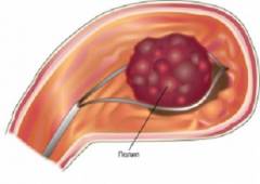 Полип на ножке представляет собой эпителиальное образование, напоминающее гриб. Длинная и подвижная ножка может ущемляться, перекручиваться или травмироваться, вызывая резкую боль в животе. Если полип находится у выхода желудка, он может затруднять эвакуацию содержимого, что приводит к застаиванию пищи и рвоте с неприятным запахом. Ущемление ножки полипа также может вызвать желудочное кровотечение.
