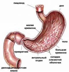 - пилорический отдел – отвечает за выход из желудка и переход в двенадцатиперстную кишку, на уровне двенадцатого грудного позвонка.