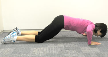 1 | Отжимания на три четверти Примите упор на полу, опираясь на руки: локти разведите в стороны, ладони на уровне плеч. Пальцы направлены вперед, ладони расправлены, локти максимально раздвинуты. Колени касаются пола, голени лежат на поверхности. Ступни на носках. Сгибая локти, опускайте плечи и торс к полу, не ниже 5 сантиметров от поверхности. Затем оттолкнитесь от пола и выпрямите руки, не отрывая ладоней от пола. Повторяйте движения. ИЛИПолноценные отжимания Примите упор на прямых руках. Ладони расправлены, пальцы направлены вперед, ладони на уровне плеч. Ноги прямые, ступни на носках. Убедитесь, что ступни стоят крепко. Можно упереть их в стену или другой неподвижный объект. Начинайте опускать торс вниз, сгибая руки в локтях и разводя их в стороны. Сгибайте руки до прямого угла между плечом и предплечьем. Не прогибайте поясницу и спину, как в упражнении «планка». Опускайтесь не ниже чем на 5 сантиметров от пола. Затем оттолкнитесь от пола, распрямите руки и повторяйте движения. | Отжимания выполняются по 12-16 повторений в 2 подхода. |
