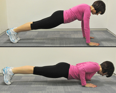 Отжимания Выполняйте отжимания, опираясь на пол. Примите горизонтальное положение, поддерживая тело прямыми руками на уровне плеч. Ноги остаются прямыми на носках. Поясница не прогибается, колени выпрямлены. Все тело должно быть в одной линии. Опускайте тело к полу, сгибая руки в локтях, при этом локти близко к торсу. Опускайтесь до расстояния 5 сантиметров от груди до пола, затем выпрямите руки. ИЛИПланка с упором на ладони Замените отжимания на планку, выполняя ее аналогично. Упор на ладонях, локти прижаты к телу. Для упрощения можно опираться на колени. | — | Важно: поддерживая тело в прямом положении, вы активируете целевые мышцы. Прогибание поясницы или разведение локтей может привести к травмам и задействованию неправильных мышц. Если упражнение сложно, опирайтесь на колени, сохраняя тело прямым. | Мышцы рук, плеч и грудные мышцы. При планке также активируются мышцы живота, паха, позвоночника и поясницы. | Отжимания — 10-15 раз за подход. Планка — 6-10 секунд в 5-8 подходах. | ||||