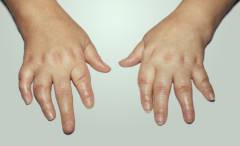 - Изменения на рентгенограммах становятся заметными через несколько лет: несимметричность конечностей, искривление пальцев, разрушение или утолщение костной ткани в пораженных суставах.