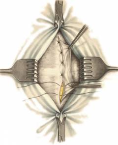 * Хирург делает разрез для доступа к грыжевому мешку.