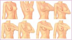 - проведет осмотр и пальпацию молочных желез в различных положениях: лежа, стоя с опущенными и поднятыми руками.