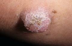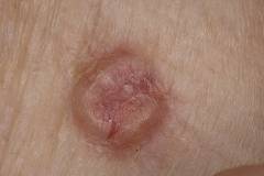 - Узелково-язвенная форма. Плотный узелок с тонкой кожей, цвет от розового до красного. Узелок растет, становится асимметричным, в центре появляется язвочка с коркой.