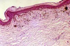 Родимое пятно увеличивается, поверхность гладкая, исчезает кожный рисунок, выпадают волосы, могут образоваться язвы.