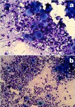Поверхность опухоли очищают от корок, затем получают мазок-отпечаток. Этот метод позволяет получить образцы клеток без повреждения опухоли. При базальноклеточном раке под микроскопом обнаруживают крупные светлые базалоидные клетки.